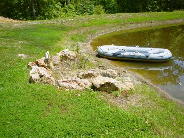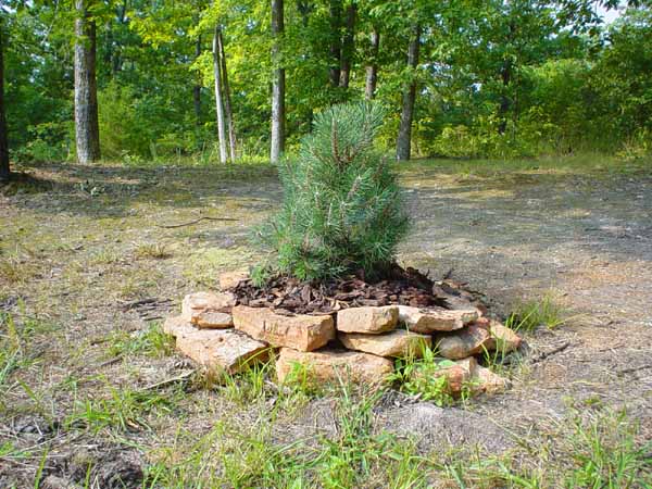 We are trying a new trick recommended by the Missouri Dept of Conservation. That trick is to not dig a hole. You un-pot the plant, set it on the ground, and build a mound of topsoil around it. The idea is to let excess water run off while the plant gradually extends its roots down into the ground. We are hoping that this trick will work. The little pine below is about 2 foot tall. I dug into the clay bank a little but made sure that the hole would drain. We stacked stone around the down-hill side of the hole and packed commercial topsoil around the root ball. It kinda' looks like a pine tree shrine instead of a Wal-Mart sale item though. Oh well, its decorative. |