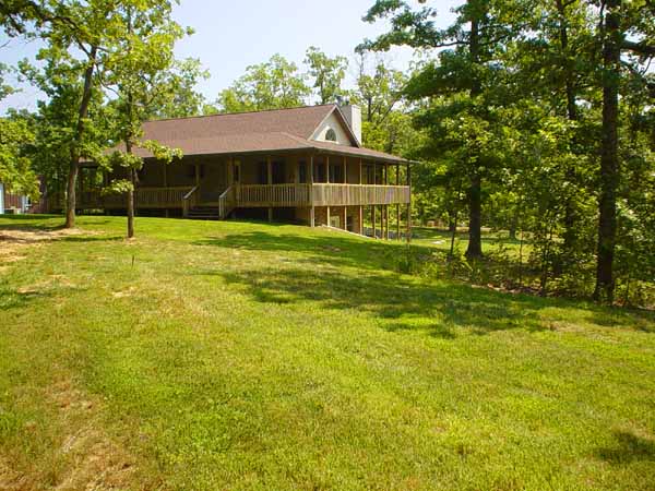 | Something that is especially nice about the Ozarks, however, is that even in a drought, it still looks pretty here. Faith has been watering the lawns up close to the house. The trees, shrubbery, and most of the green grass you see in the photo below get no extra water. | |
