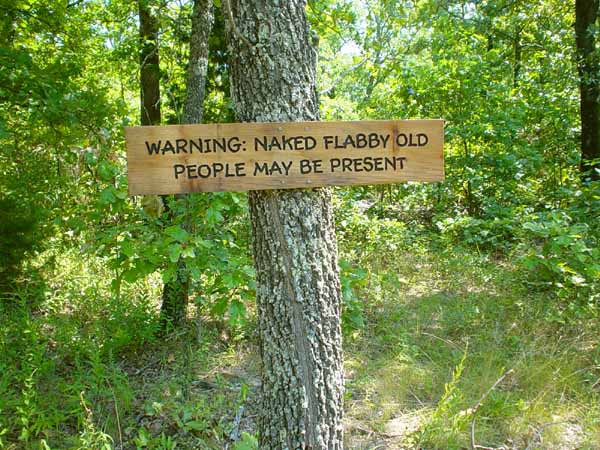 | The photo below shows the sign you see on the tree at the right side of the driveway above. We think it is amusing but haven't been able to find out how other people feel about it. We haven't actually had any guests since we put it up. We are beginning to suspect that it is working better than a "No Trespassing" sign might. | |