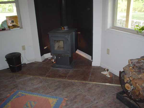 Talking to the chimney sweep about it, I learned that I had accidentally achieved an ideal chimney configuration. During construction, I had our chimney chase insulated and sheet rocked on the inside. I had it done because the wall the fireplace sits in would not be insulated. It seemed silly to put insulation everywhere except for one large wall in the living room. The insulated chase does keep the cold air out of the house but it also keeps the chimney warm. Keeping the metal chimney warm keeps wood combustion moisture from condensing in the pipe, minimizing creosote buildup. It also improves the draw. I don't mind being right about something, even if it was for the wrong reason. There was actually a second reason for calling in a chimney sweep. We had him install a new chimney cap. The old one did not have a screen so we have had birds dropping in and getting stuck. It is a real annoyance to have a trapped bird flapping its wings and chirping as it tries to escape. I was getting tired of taking the chimney pipe loose from the stove to get the birds out. It was also pain in the butt to get them out of the house. We never did manage to capture any of them as they emerged from the pipe. We had to chase them around the basement with nets. Our cat, Rocky, did manage to capture one once. The photo below shows the woodstove. It is in a corner of the basement. The black panels behind it are sheet metal heat shields. They are spaced out from the wall about an inch so that when heat from the stove warms them, they draw cool air up from the floor to keep the wall materials from overheating. The heat shield air draft works so well that the sheet metal never gets so hot you can't hold your hand on it. The power cord and shiny metal thing you see on the floor behind the left side of the woodstove is a temporary light that I used to show more detail. I found it is hard to get good photographic detail in a black on black scene. We keep the fire burning in this woodstove 24 hours a day for weeks at a time during the winter. It has held up very well and is very efficient. It makes the basement very cozy in the winter. Its heat rises and warms the floor above so that this small woodstove keeps the house warm all by itself until the temperature outside gets below 35 degrees. Our gas furnace starts cycling on at lower temperatures but even then most of our heat still comes from the wood we burn. |