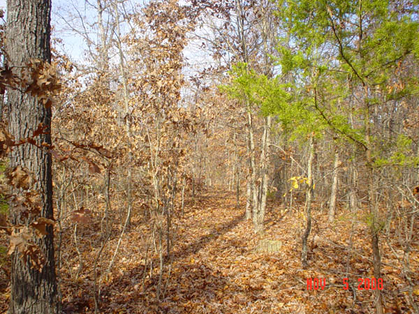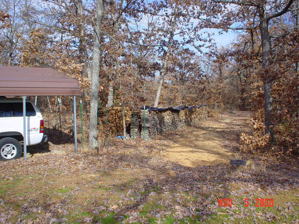 Naturally, with winter coming on, thoughts turn to firewood. I have two main firewood racks next to the road down to the lake behind our property. Each rack is a double row of cord wood, 50 feet long and 5 foot high. They hold about 4 cords each. We burn about 3 1/2 to 4 cords of wood in our woodstove each year. What you see in the middle of the photo above is the 2008/2009 winter firewood. It is the rack with the black plastic rain shield running along the top. The plastic keeps most of the rain from soaking down through the wood but allows air to flow through the stack to dry the wood. Firewood from our oaks, hickory, and walnut trees requires a minimum of 6 to 8 months to dry the correct 20% moisture level to burn in a woodstove. |