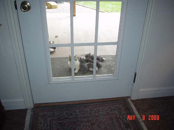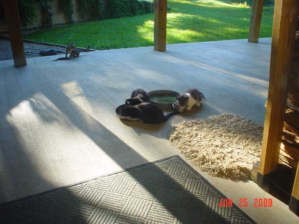 A short time later, another feral cat gave birth in one of the modified ice chest cat condos outside the basement door. She had been showing up just about every evening for food. Since we had guessed she was pregnant, we made sure she had adequate food. She was too feral to allow us to approach her so we didn't know when she went into labor. One morning we noticed her in the ice chest with four newborn kittens. She took them out into the woods where she apparently lives. When they reached an age where they began to need solid food, she brought them back. We now have momma cat, who we named Little Girl, and her four kittens, Molly, Tiger Lilly, Darrel, and the other Darrel (Two identical black kittens) at our back door every evening. |