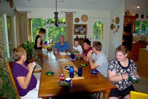 Naturally, with the barbeque available, we have barbeques. It is another good excuse to have friends and family over for dinner. In the above photo, dinner is over and we are starting to pick the dishes up. Notice how I look down there at the end of the table. This barbeque happened in the middle of those two weeks of hot weather we had this summer. I got very hot standing over the barbeque pit cooking dinner for this crowd. As you can see my shirt is still a bit wet from sweat and my face looks like I haven't cooled off yet. I enjoyed it anyway. |