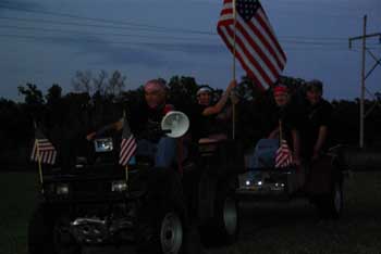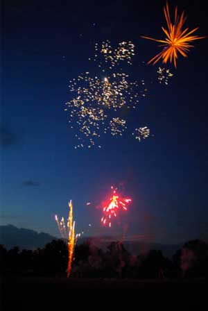 Folks here in the Ozarks are a little more casual about fireworks rules than what city people are used to. The first time some friends of ours here asked us to come over and watch the neighbors set off fireworks on the 4th of July, we pictured some kids waving some sparklers and watching a few colored safe-and-sane fireworks spray a few feet into the air. We figured we would have some watermelon and tell a few jokes. That sounded like an OK way to spend the evening. When we got there, we discovered something rather larger was being set up. It was the greatest fireworks show we had ever seen. Their neighbors spend thousands of dollars on their fireworks. These are big-boy fireworks they shoot off that explode hundreds of feet up in the sky. Their show typically run for 30 to 40 minutes with no gaps and multiple mortars shooting stuff off the whole time. You can see the fireworks crew in the photo above stopping by to dedicate the show before going back to their positions at the mortars. |