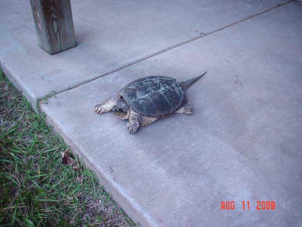 Now, back to the critter theme. Late summer is when the turtles start laying eggs. This Snapping Turtle made a wrong turn and ended up outside our basement. I tossed her back into the pond so she could try again to find a good egg laying spot. Yep, Snapping Turtle. They are very common here. They can be dangerous out of the water. They tend to be very aggressive to protect themselves since they cannot pull their limbs all the way into the shell like other turtles. Fortunately, they are very docile in the water. You can bump them or step on them while they are submerged and they will swim away. By the behavior we have observed, we believe they are a little more intelligent that other kinds of turtles. About the only hazard they represent in the water is that their jaws are very strong so an accidental bite could be very painful. We've never met anyone who even knows of anyone actually bit by one. We just ignore them like all the other turtles. |